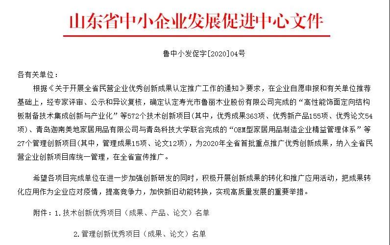 近日,山东省中小企业发展促进中心公布2020年首批创新成果评选结果,泰宝集团四项研发成果分别荣获山东省企业创新优秀成果一、二、三等奖。